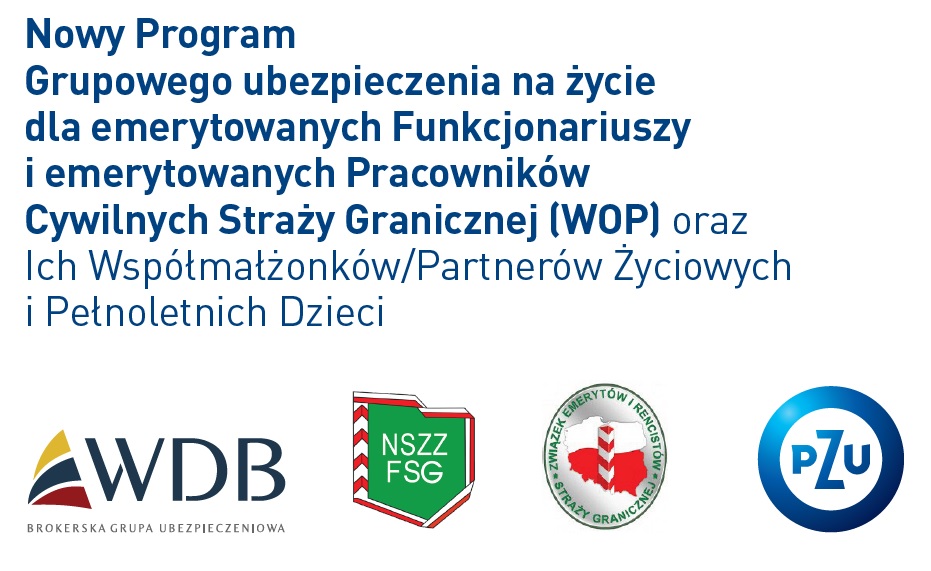 Z przyjemnością informujemy, że NSZZ FSG we współpracy z ZEiR SG i brokerem WDB S.A. zakończył z sukcesem trwające od kilku miesięcy negocjacje dotyczące nowego Programu Grupowego Ubezpieczenia na życie dla Emerytowanych Funkcjonariuszy i Emerytowanych Pracowników Cywilnych Straży Granicznej (WOP) oraz Ich Współmałżonków/Partnerów i Pełnoletnich Dzieci w PZU Życie.